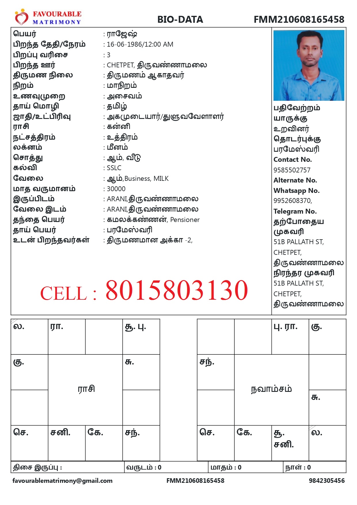 இணையதள திருமண தகவல் மையம் குறைந்த செலவில் நிறைந்த பயன் திருமணம் முடியும் வரை ஒரு முறை கட்டணம். (Awareness matrimony) வரன் முடிந்தவுடன் எங்களுக்கு தெரியபடுத்தவும்.